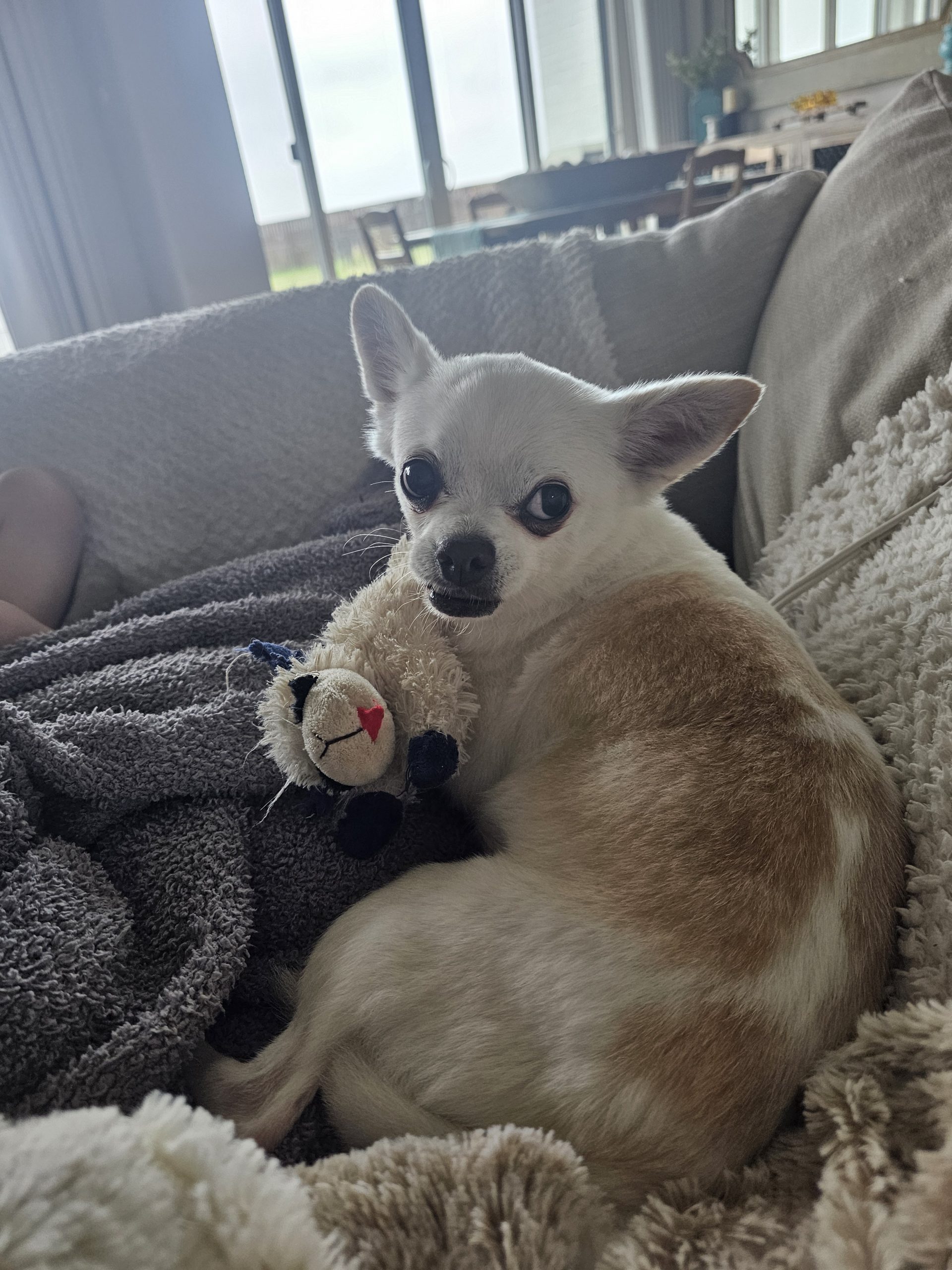 Toro’s a sun-worshipping, sheep-toy-toting pro who knows his stuff—commands like “sit,” “go to cage,” and “go to bed” are his jam. He’s super protective of his favorite humans, making him the loyalest of loyal sidekicks. Toro can be wary of new people and kids at first, needing a little time to size them up, but once he feels safe, he’s all in with love and affection (just no tail-pulling or eye-poking, please—he might nibble with his half-toothless grin to say “chill, dude!”). Other dogs and cats? Meh, he’s cool but mostly does his own thing, though he’s been caught sneaking a play session with a kitty pal.